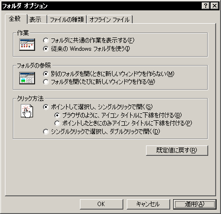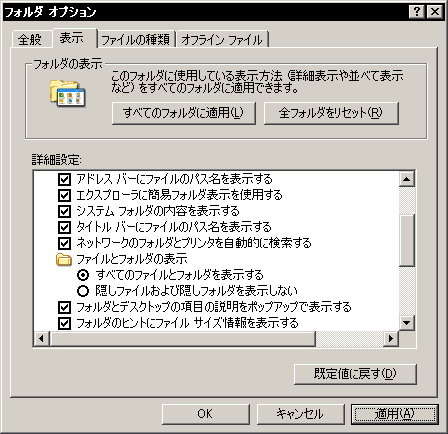 エクスプローラを起動し、「ツール」から「フォルダオプション」を開き、「全般」タブの「作業」領域で、「従来の Windows フォルダを使う」のラジオボタンを有効にします(図1)。フォルダ・ファイルの一覧表示が以前のバージョンの Windows のような画面になり、システムへの負荷が軽減されます。また、「表示」タブの「詳細設定」領域の中ほどにある、「ファイルとフォルダの表示」項目は、「すべてのファイルとフォルダを表示する」のラジオボタンを有効にします(図2)。この変更でも、若干システムへの負荷が軽減されます。