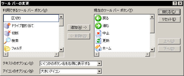 次に、「表示」から「ツールバー」を選択し、「ユーザー設定」をクリックします。「ツールバーの変更」ウィンドウが開くので、必要に応じて、ボタン類のカスタマイズを行ってください。「戻る」「進む」「中止」「更新」「ホーム」「お気に入り」「履歴」のみを表示、これ以外のボタンは非表示とし、「テキストのオプション」で「いくつかのボタン名を右側に表示する」を選択しておけばよいでしょう(図11)。