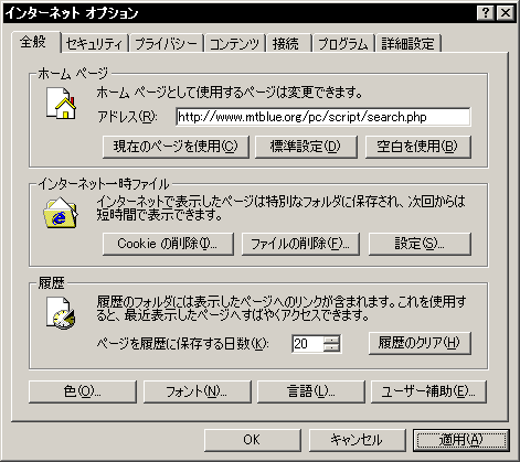 「全般」タブの、「ホームページ」領域では、ブラウザが起動したときに最初に表示されるページを指定できます。メーカー製のコンピュータの場合、そのメーカーのウェブサイト、あるいはプロバイダのウェブサイトであり、クリーンインストール直後の自作パソコンでは MSN のウェブサイトが設定されていますが、不要な画像がふんだんに使われているため、体感速度を大幅に低下させています。Yahoo か Google あたりを指定しておけば、速度も利便性も格段に向上します。私は、手前味噌ですが 本サイトのページ「検索・翻訳」 をホームページに設定しています(図12)。