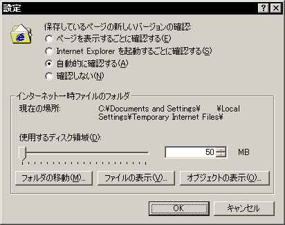 「インターネット一時ファイル」領域では、一度閲覧したページをローカルに保存し、二度目以降の閲覧の効率を高める機能についての設定を行えます。しかし、使用するディスク容量がとんでもない大容量に指定されている場合が多いため、ディスクを圧迫します。50MB もあれば十分なので、指定し直すとよいでしょう。「設定」ボタンをクリックし、「インターネット一時ファイルのフォルダ」領域の「使用するディスク領域」という項目のスライダをスライドさせるか、容量を直接数値で入力することで指定できます(図13)。