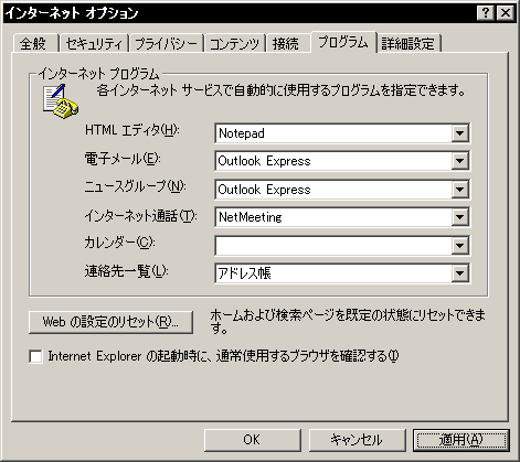 「プログラム」タブの「Internet Explorer の起動時に、通常使用するブラウザを確認する」というチェックボックスを無効にします(図14)。ブラウザの起動のたびにチェックが入るのを防げます。