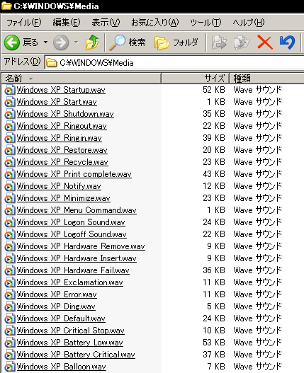 例えば、起動時に再生される「Windows XP Startup.wav」というファイルは、実に 400KB を超える巨大なファイルです。その他、ほとんどの音源が、「22KHz・16bit・ステレオ」という、CD 並みの高音質でサンプリングされているので、「11KHz・8bit・モノラル」にサンプリングし直します。サンプリングし直したファイルを、Windows がインストールされているドライブの WINDOWS\Media\ フォルダに上書きします(図15)。私がサンプリングした音声ファイルをアップロードしておきますので、リサンプリングが面倒な場合はご利用ください。ただし音質はデフォルトよりも低くなります。書き戻す場合に備え、デフォルトの音声ファイルをバックアップしておいてください。