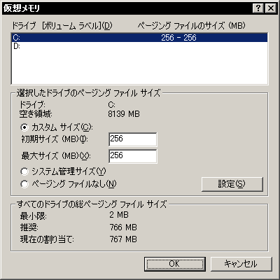 ページングファイルの最適値については様々な意見があります。ある人は「物理メモリとページングファイルの合計が500〜700MB程度」と言い、ある人は「ページングファイルは物理メモリの1.5倍」と言い、ある人は「システム推奨最大値で固定すべき」と言い、ある人は「物理メモリが512MB以上あるのなら、ページングファイルは必要ない」と言います。また、Microsoft の推奨値は、物理メモリ+12MB です。実際のところ、よく分かりません。