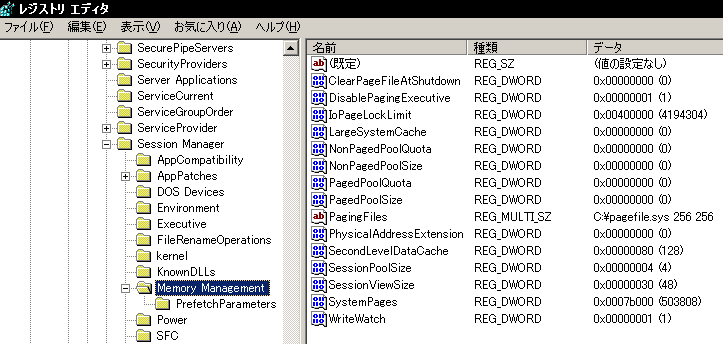 この項目は、レジストリの HKEY_LOCAL_MACHINE\SYSTEM\CurrentControlSet\Control\Session Manager\Memory Management\ に存在する DWORD 値、DisablePagingExecutive を直接編集することでも設定できます(図20)。カーネルを物理メモリに配置する場合は16進数で1を、配置しない場合は16進数で0を、それぞれ指定してください。