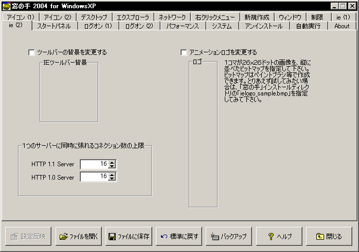 「ie (2)」タブを開き、「1つのサーバーに同時に張れるコネクション数の上限」フィールドで、HTTP 1.1・1.0 サーバー共に、8〜32くらいの数値(整数)を指定してください(図21)。インターネットへの接続効率が高まります。