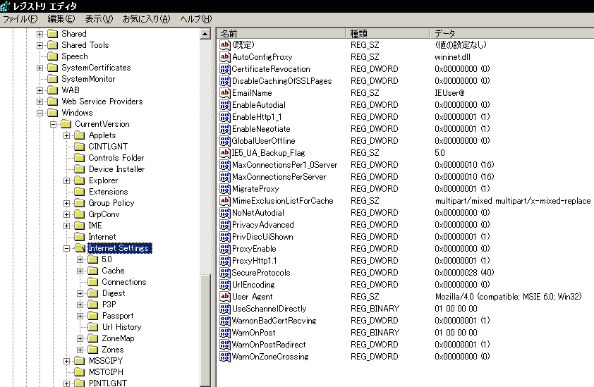 この項目は、レジストリの HKEY_CURRENT_USER\Software\Microsoft\Windows\CurrentVersion\Internet Settings\ に存在する DWORD 値、MaxConnectionsPer1_0Server および MaxConnectionsPerServer を直接編集することでも設定できます(図22)。それぞれ、10進数で16程度の値を指定すればよいでしょう。