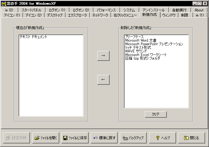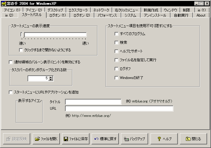 「窓の手」という、レジストリ編集ソフトウェアを利用することで、レジストリエディタを起動することなく容易にレジストリの編集を行うことができます。レジストリを編集することで、Windows の挙動をより詳細に設定することができます。同ソフトウェアで設定できる項目は多数ありますが、そのうちの基礎的なものを以下に示します。「窓の手」をインストールしていない場合は、「窓の手」公式サイト よりダウンロードし、インストールされるとよいでしょう。以下の記述は、本稿執筆時点(2004年7月30日)で最新版の、「窓の手 2004 for Windows」についてのものです。バージョンの違いにより、若干の相違があるかも知れないことを、あらかじめご承知おきください。