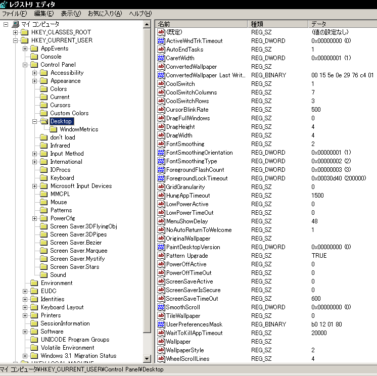 この項目は、レジストリの HKEY_CURRENT_USER\Control Panel\Desktop\ に存在する文字列値、MenuShowDelay を直接編集することでも設定できます(図24)。値のデータを 0 から 65535 の間で指定してください。0 が最も速く、65535 が最も遅い設定です。私の設定は 48。ただし、0 に設定すると不具合が発生する場合があるようなので、1 から 65535 の間で指定するようにするとよいでしょう。