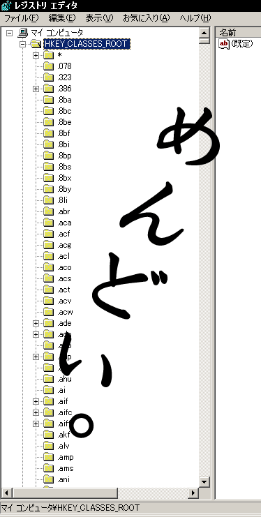 この項目は、レジストリの HKEY_CLASSES_ROOT\[当該の拡張子]\ に存在するキー、ShellNew を直接編集することでも設定できます。削除したい拡張子がある場合、その拡張子のキー ShellNew ごと削除してください。ただし、レジストリエディタからの直接編集 による復旧は面倒(図27)であるため、「窓の手」から削除することをお薦めします。