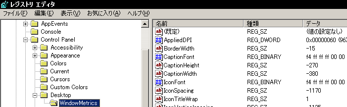 レジストリエディタを起動し、HKEY_CURRENT_USER\Control Panel\Desktop\WindowMetrics\ を開きます。ここに存在する CaptionWidth の値の変更により、ボタンの横幅を変更することができます(図28)。-380 程度の値を推奨します(初期値は -270)。再起動後、ボタンが大きく表示され、クリックしやすくなります(図29)。