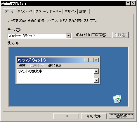 次に、デスクトップの何もないところで右クリックし、「プロパティ」をクリックします。表示される「画面のプロパティ」ウィンドウの「テーマ」タブの、「テーマ」領域のプルダウンメニューから、「Windows クラシック」を選択し、適用します(図3)。LUNA インターフェイスを廃することにより、システムへの負荷を軽減することができます。また、「デザイン」タブの「詳細設定」ボタンから「デザインの詳細」を呼び出し、「アクティブ タイトル バー」「非アクティブ タイトル バー」の「色 1」と「色 2」を同じ色にします(図4)。グラデーション処理を廃することで、システムへの負荷を軽減できます。