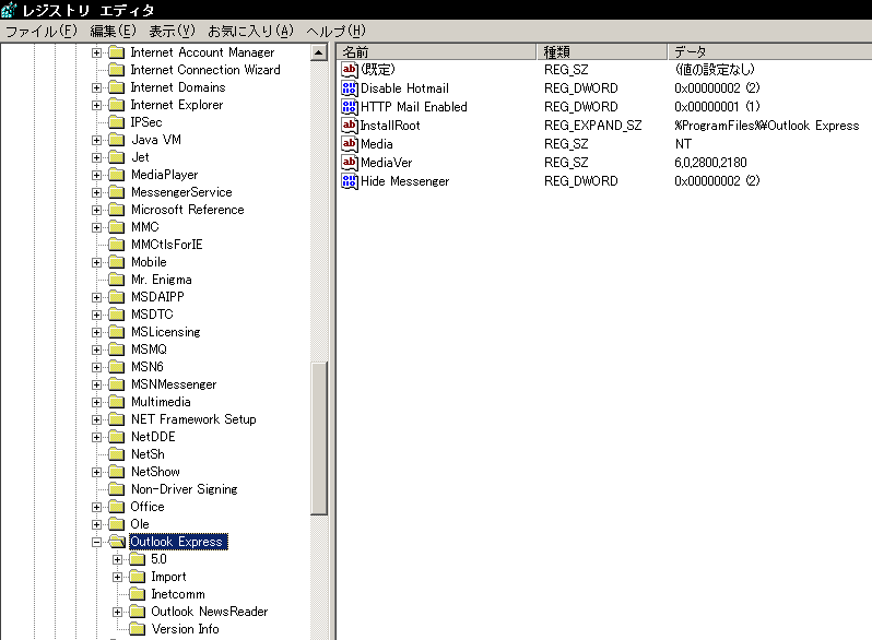 レジストリエディタを起動し、HKEY_LOCAL_MACHINE\SOFTWARE\Microsoft\Outlook Express\ を開きます。ここに DWORD 値 Hide Messenger を新規作成し、16進数で値を 2 とします(図31)。