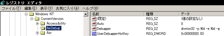 レジストリエディタを起動し、HKEY_LOCAL_MACHINE\SOFTWARE\Microsoft\Windows NT\CurrentVersion\AeDebug\ を開きます。ここに存在する文字列値 Auto の値を、16進数で 0 とします(図32)。