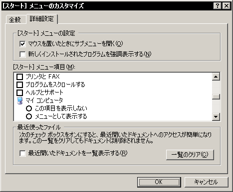 スタートボタンを右クリックし、「プロパティ」をクリック、「カスタマイズ」ボタンをクリックします。「タスクバーと[スタート]メニューのプロパティ」ウィンドウが表示されるので、「詳細設定」タブの「[スタート]メニューの設定」領域にある「新しくインストールされたプログラムを強調表示する」というチェックボックスを無効にします。さらに、[スタート]メニュー領域で、必要でない機能へのショートカットアイコンを表示しないようにします。また、「最近使ったファイル」領域にある「最近開いたドキュメントを一覧表示する」というチェックボックスを無効にします(図5)。スタートボタンの反応速度・一覧性が向上します。
