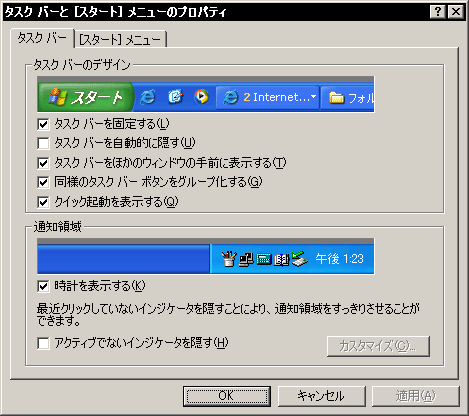 上のウィンドウの「タスクバー」タブに切り替え、「通知領域」フィールドの「アクティブでないインジケータを隠す」というチェックボックスを無効にします(図6)。インジケータが大量に表示される場合、それぞれのインジケータをスタートアップ時に読み込まないよう、各種設定を行ってください。これらの設定で、スタートボタンとタスクバーがシステムにかける負担を軽減することができます。