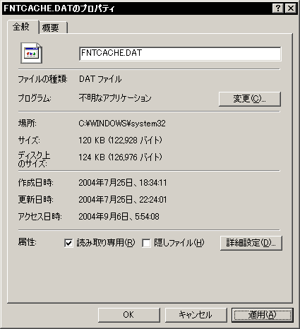 エクスプローラから、Windows がインストールされているドライブの WINDOWS\system32\ フォルダを開き、ここの「FNTCACHE.DAT」というファイルを右クリック、「プロパティ」をクリックします。「全般」タブの「属性」領域の、「読み取り専用」チェックボックスを有効にします(図7)。起動時の処理が速くなり、フォントの破損もある程度防げます。