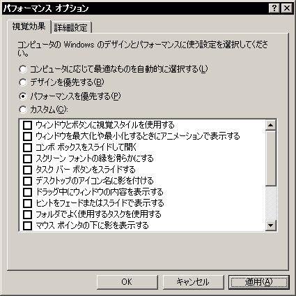 マイコンピュータを右クリックし、「プロパティ」をクリックします。表示される「システムのプロパティ」ウィンドウの「詳細設定」タブの、「パフォーマンス」領域の「設定」ボタンをクリックします。「パフォーマンスオプション」ウィンドウが表示されるので、「視覚効果」タブで「パフォーマンスを優先する」のラジオボタンを有効にします(図8)。全てのチェックボックスのチェックが外れます。この状態にすることで、パフォーマンスを最大限に優先することができます。ただし、「スクリーンフォントの縁を滑らかにする」のチェックボックスのみ有効にすることで、フォントのアンチエイリアスを有効にできます。パフォーマンスは若干低下しますが、眼への負担を軽減することができるので、この項目は有効にしておくのがよいでしょう。無効にすることで、特にパフォーマンスを向上させることができる項目に、次のようなものがあります。