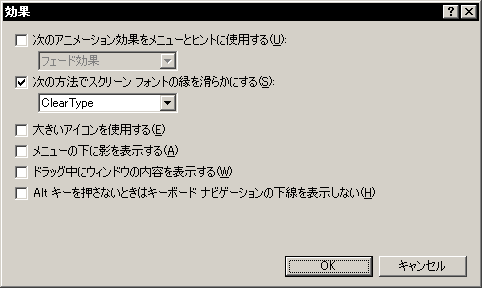さらに、「画面のプロパティ」(デスクトップの何もないところで右クリックをして「プロパティ」をクリックすると表示されます)から「デザイン」タブを開き、「効果」ボタンを押すことで設定できる項目も設定しておきましょう。表示される「効果」ウィンドウの、すべてのチェックボックスを無効にします。特に、「次のアニメーション効果をメニューとヒントに使用する」と「ドラッグ中にウィンドウの内容を表示する」のチェックボックスを無効にすることで、かなりのリソースを確保することができます。なお、「次の方法でスクリーンフォントの縁を滑らかにする」チェックボックスは、「Clear Type」を指定して有効にしておくとよいでしょう(図9)。上の設定で「スクリーンフォントの縁を滑らかにする」を有効にした場合、この項目も併せて有効にしておく必要があります。